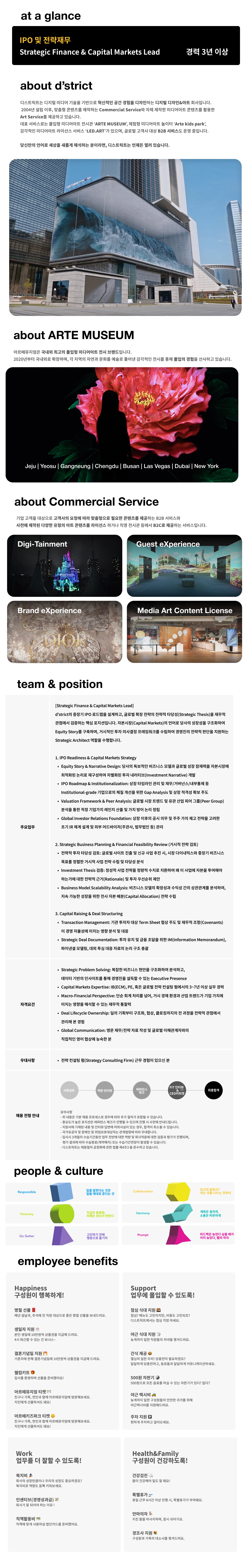 디지털이 숨쉬는 혁신적인 공간 경험을 만들어 가는 디스트릭트의 여정에 함께하실 분들을 모시고 있어요. 지원방법 아래 지원하기 버튼을 클릭 후 관련 서류를 업로드 해주세요! - 첨부서류: 국문 이력서, 자기소개서, 경력기술서, 포트폴리오 등 지원 서류 지원하기 지원방법2 지원하기 양식을 통한 지원이 어려울 경우, 채용 메일(onboarding@dstrict.com)로 지원 서류 첨부 후 접수 - 메일제목: [입사지원/포지션명] 성함 - 첨부서류: 국문 이력서, 자기소개서, 경력기술서, 포트폴리오 등 지원 서류