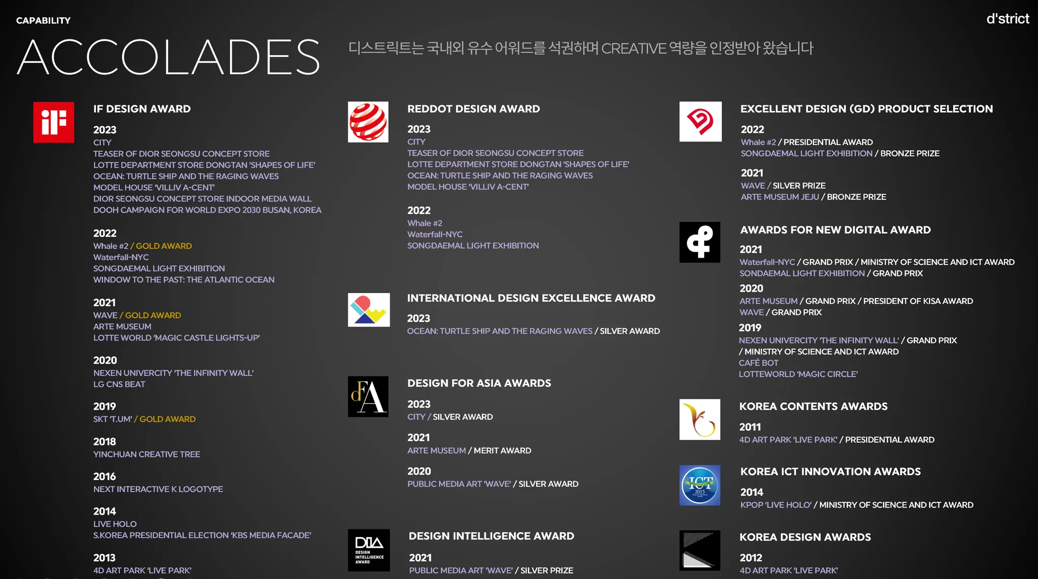 디스트릭트는 국내외 유수 어워드를 석권하며 CREATIVE 역량을 인정받아 왔습니다.